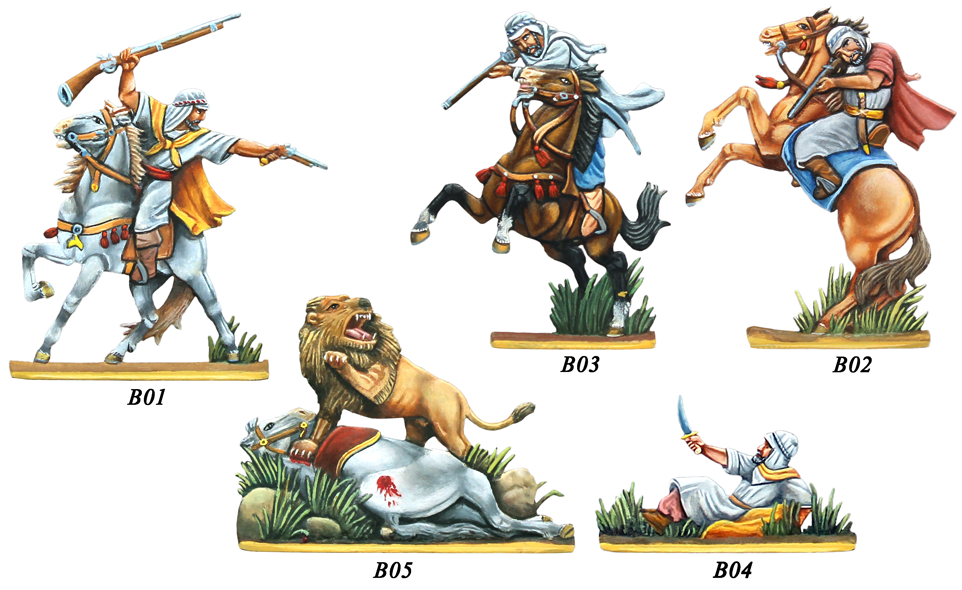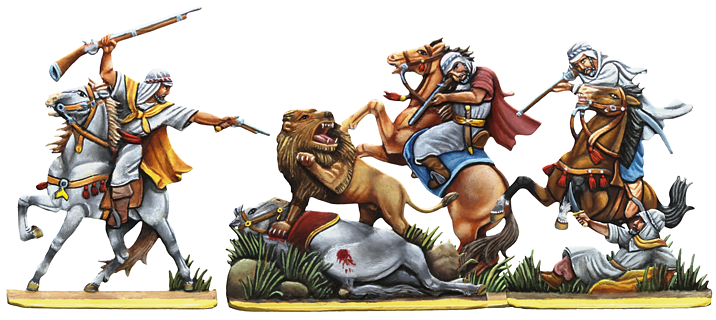 Serie Nr. 13 „Löwenjagd (Figurengröße 30 mm)“![]() Für eine größere Darstellung klicken Sie auf das Bild. Zeichnung: Fritz Gorges Gravur: Regina Sonntag Die Serie besteht aus fünf Figuren: Der Löwe mit seiner Beute, drei Berber zu Pferd und ein Berber, nunmehr ohne Pferd. ![]() Bemalung: Martin Lother, Würzburger Zinnfiguren, 97277 Neubrunn |