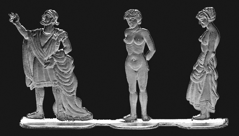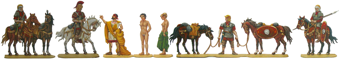 Serie Nr. 16 „Antiker Sklavenhandel“![]() Zeichnung: Franz Karl Mohr Gravur: Regina Sonntag Für eine größere Darstellung klicken Sie auf das Bild. Die Serie besteht aus drei Spezialfiguren (Sklavenhändler mit zwei Sklavinen). Einer der großen Sklavenmärkte der Antike war Chios, dass seinen erfolgreichen Handel ab dem 7. Jahrhundert v. Chr. führte. Daneben waren zu den unterschiedlichen Epochen Athen, Korinth, Delos und Herakleon auf Kreta Hauptumschlagplätze der menschlichen Ware. Auf Delos wurden zeitweise bis zu 1000 Menschen pro Tag in die Sklaverei verkauft. Die Preise variierten je nach der Aufgabe, die ein Sklave zu erfüllen hatte. Ein Sklave konnte das Mehrfache des Preises für ein Rind oder Schaf kosten (200 - 300 Drachmen). Wertvolle Sklaven wurden für den Gegenwert eines kleinen Landgutes gehandelt. Von hier aus wurden die anderen Mittelmeerländer mit Sklaven versorgt. ![]() Zeichnung: Franz Karl Mohr Gravur: Regina Sonntag Für eine größere Darstellung klicken Sie auf das Bild. |