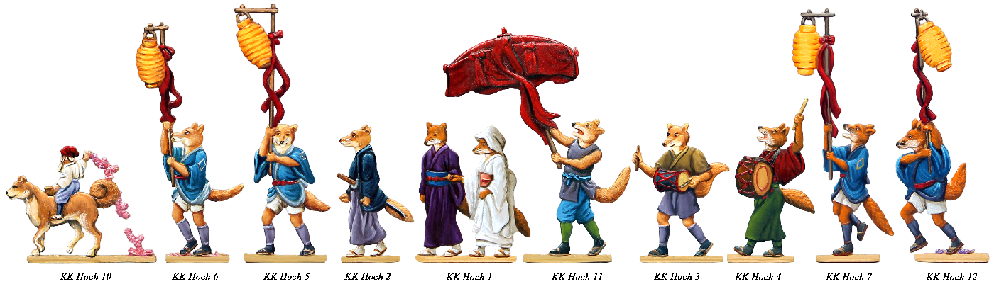 Serie Nr. 18 „Hochzeitszug der Füchse (Vitrinenfiguren)“![]() Für eine größere Darstellung klicken Sie auf das Bild. 40 mm Vitrinenfiguren. Die Serie besteht aus 10 Figuren. Wer Glück hat, sieht vielleicht einen Yomeiri, den Hochzeitszug, der die Fuchsbraut dem Hause des Bräutigams zuführt. Wenn bei der Hochzeit der Menschen die Überführung der Braut bei Dunkelwerden erfolgt, so ist bei den Füchsen eine Abweichung zu konstatieren; sie wählen dafür am liebsten die Zeit eines Sonnenregens. Deshalb sagt der Japaner, wenn es bei hellem Sonnenschein regnet: „Jetzt wird die Braut des Fuchses eingeholt“. Aber nicht nur in Japan: So sagt man beispielsweise in Schlesien beim Aufsteigen eines Gewitters „der Fuchs braut“. Genau wie bei den Menschen geht es bei der Feierlichkeit des Konrei, der Hochzeit, zu. Die Verwandten und Freunde der Braut versammeln sich in deren Haus und begleiten bei Anbruch der Dunkelheit die Sänfte, die die in weiße Seide gekleidete Braut birgt, zur neuen Wohnung, in der sie nicht nur der Bräutigam, sondern auch ein festliches Mahl erwartet. Die Braut bringt in ihrer Sänfte einen Kübel voll Hamaguri-(Venus-)Muscheln, zur Bereitung der Hochzeitssuppe, sowie die sieben Geschenke für den Bräutigam, seidene Kleider, Fächer, Gürtel usw. mit. Beim Eintritt in die neue Heimat ist der Kopf mit einer großen weißseidenen Kappe, Wata boshi, oder durch eine Kapuze, die Tsuno kakushi; verhüllt. Durch Herausnehmen der Schiebewände sind mehrere Zimmer zu einem großen Empfangsgemach vereinigt worden; in diesem sind der Brautschatz nebst Dekorationen von symbolischer Bedeutung aufgestellt. Ein Bild von Fukurokuju, einem Mitglied des Glücksgötter-Septemvirates, schmückt die Wand; Bronze- und Lackgerätschaften sind mit langschwänzigen Schildkröten und Kranichen, den Repräsentanten hohen Alters, verziert. Eine plastische Darstellung des Horaisan, eines mythischen Berges im Ozean, auf welchem die Sennin, die nie alternden Genien, wohnen und die Takasago no matsu, die doppelstämmige Kiefer von Takasago, werden selten fehlen. Die eigentlichen Trauungszeremonien beschränken sich auf den Genuss von Sake aus bestimmten Gefäßen und nach bestimmten Regeln, die einer tieferen Bedeutung nicht entbehren. Zuerst schenkt der Bräutigam der Braut ein; er wirbt um ihre Gunst. Später schenkt sie ihm ein; sie ist ihm Untertan. Schließlich machen beide die Runde bei den Gästen. Sie tragen gemeinschaftlich die Sorgen des Haushaltes wie die des Lebens. Ein Priester ist bei der ganzen Feierlichkeit nicht nötig; die wichtigste Person ist vielleicht, mit Ausnahme der Brautleute, der Nakodo oder Chiunin, d.i. der Heiratsvermittler, der die geschäftlichen Fragen vor der Hochzeit ins Reine gebracht hat. Legale Weihe erhält die Hochzeit durch die Registration des Paares auf dem Polizeibüro. Da unser Fuchspaar dieses letzte Erfordernis wohl kaum erfüllen wird, durfte die legale Gültigkeit ihrer Verbindung angezweifelt werden können. |
