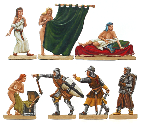 Serie Nr. 37 „Der erste Kreuzzug: Die Frauen von Dorylaion“![]() Zeichnung: Fritz Gorges Gravur: Bernd Graf Für eine größere Darstellung klicken Sie auf das Bild. • Drei aufgebrachte Kreuzfahrer • Vier verblüffte Frauen Während des 1. Kreuzzuges (1096 bis 1099) kam es unweit der Stadt Dorylaion (heute Eskesehir in Anatolien) zu einer Schlacht zwischen dem Kreuzfahrerheer und dem Heer des Seldschukenfürsten Kilidsch Arslan (Der Schwert-Löwe). Den Seldschuken gelang anfangs der Einbruch in das Lager der Kreuzfahrer. Unter den mitziehenden Frauen der Kreuzfahrer ging das Gerücht um, dass alle attraktiven Frauen von den Siegern in ein Serail gebracht würden, während Kinder, alte und unattraktive Frauen in die Sklaverei geführt würden. Deshalb begannen viele Frauen sich zu schmücken und festlich zu kleiden oder auch zu entkleiden und ihre Reize ins rechte Licht zu rücken, um so der Sklaverei zu entgehen. Nun wendete sich jedoch das Kriegsglück und das Seldschukenheer wurde von den Kreuzfahrern besiegt. Die zurückkehrenden Ritter fanden ihre Frauen in den verführerischsten Ausstattungen und Posen vor. Ihre Entrüstung war groß und man beschloss, die Frauen zur Strafe künftig aus dem Heereszug zu verbannen und sie in einem gesonderten Frauenlager zu internieren, wie es beispielsweise bei der späteren Belagerung der Stadt Antiochia geschah. Mit der vorliegenden kleinen Figurenserie kann man diese Episode darstellen. |