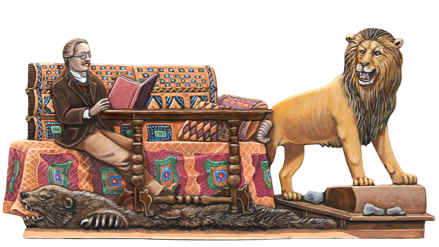 seines Arbeitszimmers von 1896 – ein ausgestopfter Löwe, Bärenfelle, exotische